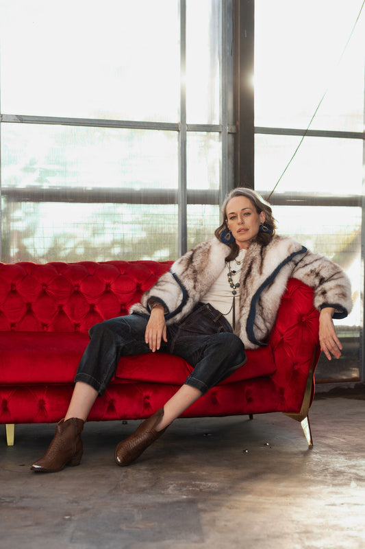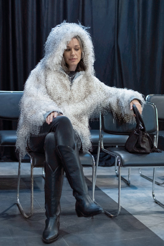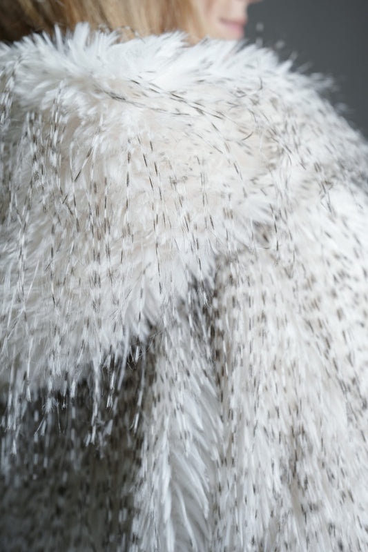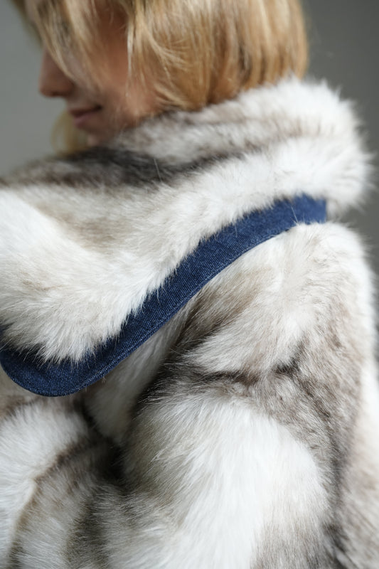 Ivory Faux-Fur Coat with Grey Gradient and Denim Trim