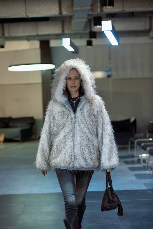 White-Grey Gradient Faux-Fur Hooded Coat with Denim Trim