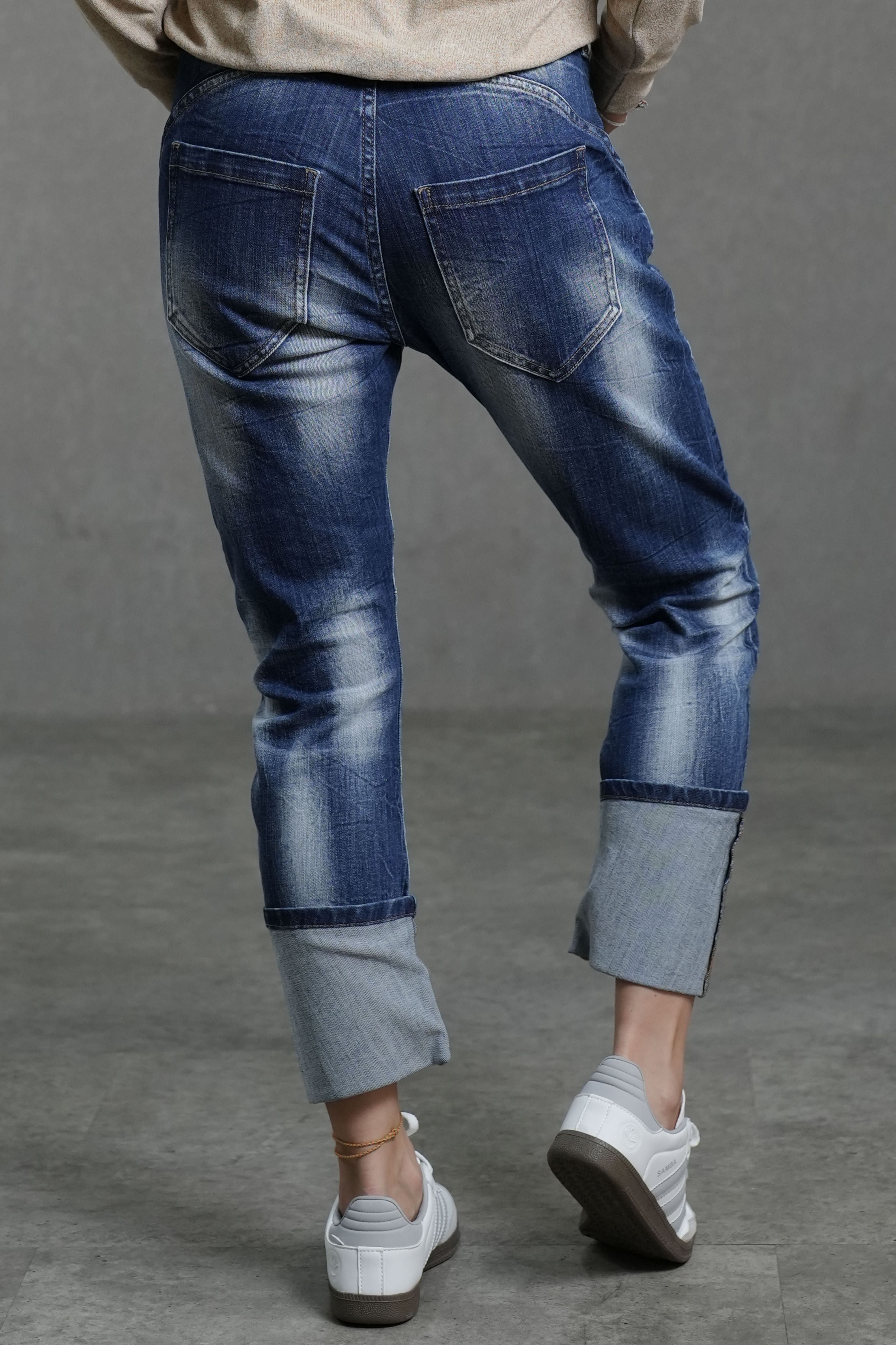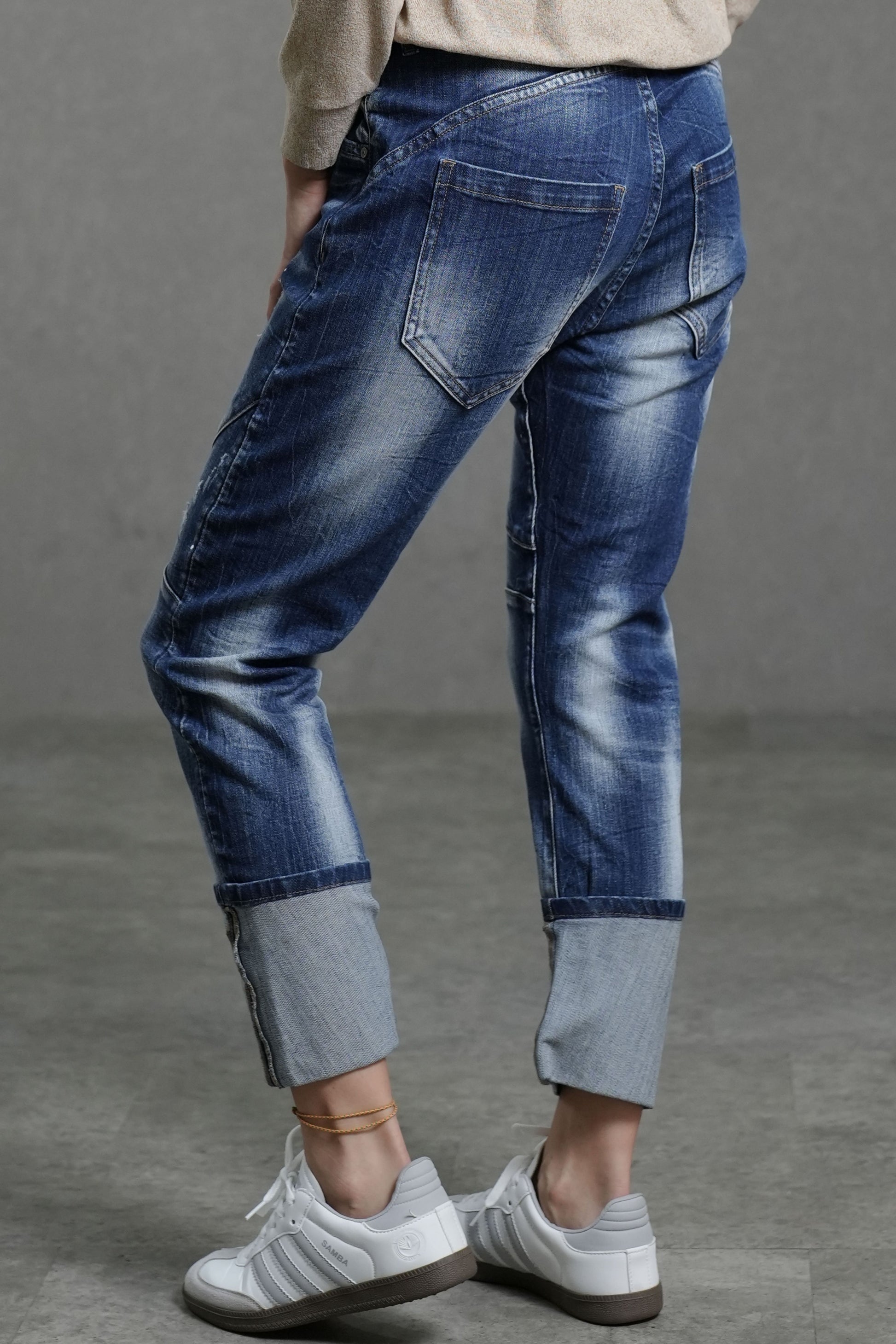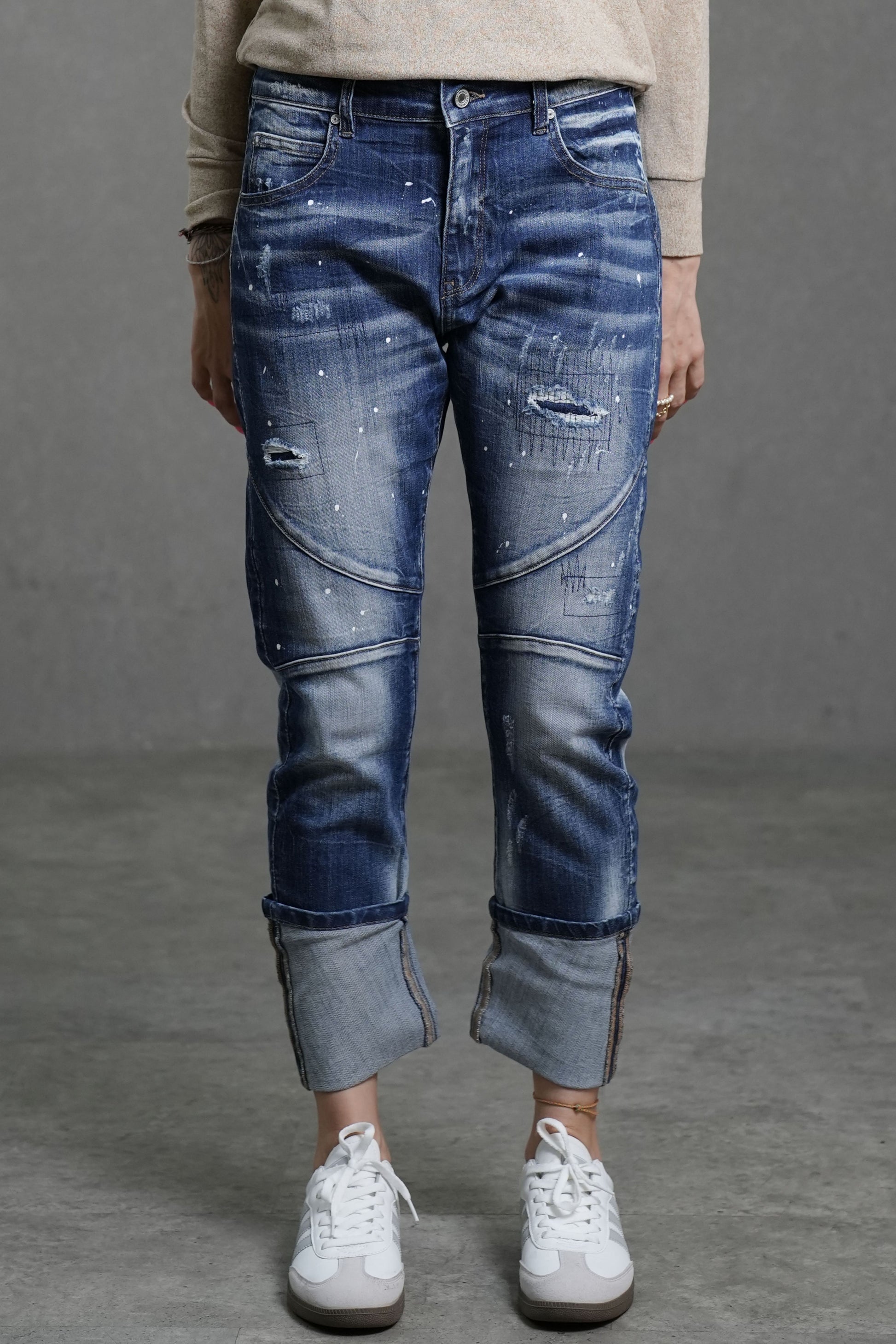 Crafted from soft, high-stretch denim that adapts naturally to your shape, these jeans offer a close fit without restriction—ensuring ease and confidence all day long. Designed with a mid-rise waist and slim tapered leg, the cuffed hem can be styled cropped or worn long for versatile looks. Distressed abrasions and subtle paint-splatter effects add a bold, street-inspired character.