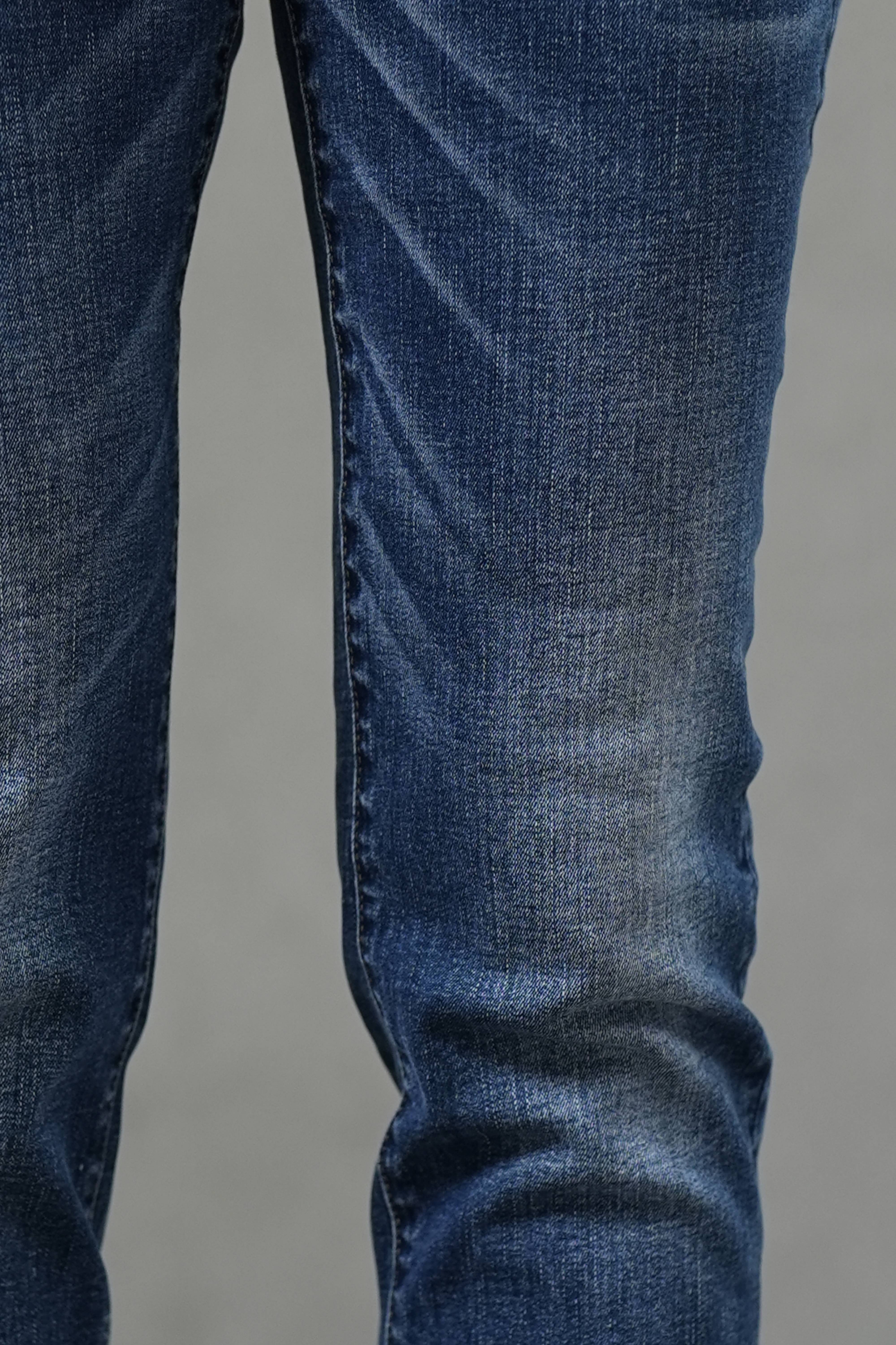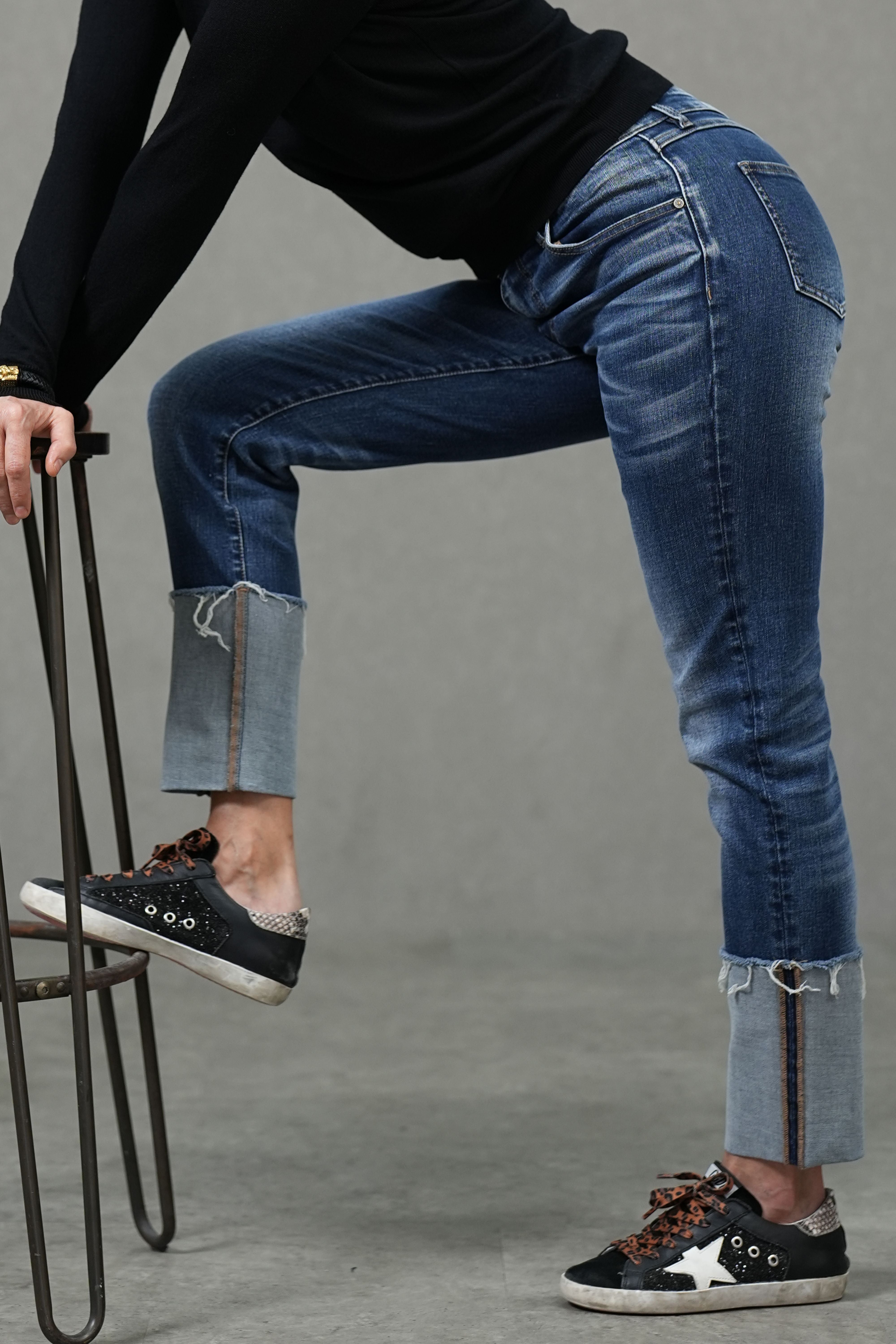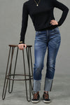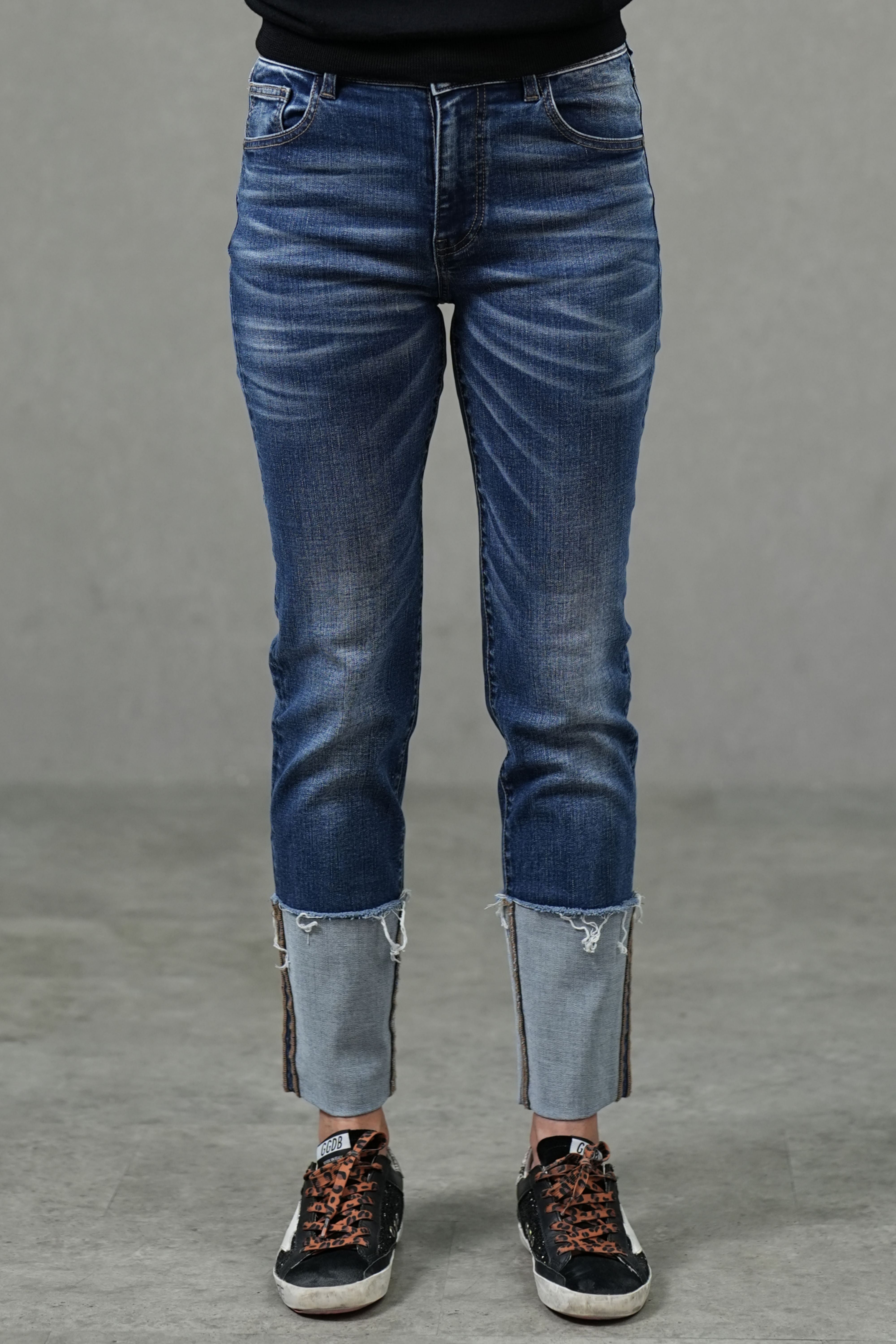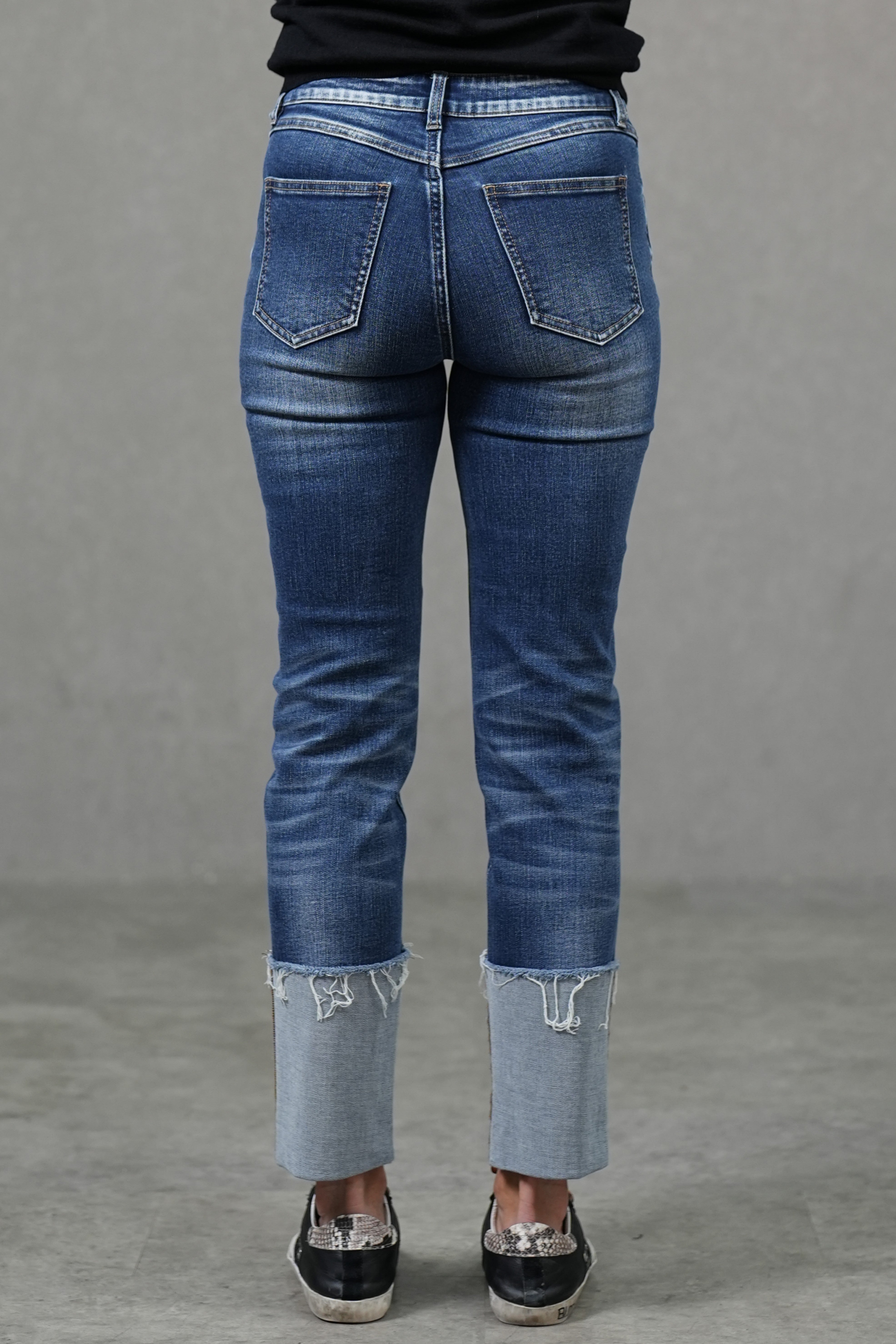 Cut in a slim cigarette silhouette with a fixed cuffed hem, these jeans sit comfortably at the mid-rise and create a clean, elongated line to the ankle. Crafted from mid-stretch denim, they balance gentle flexibility with a structured look—finished with subtle whiskering for easy, everyday styling.