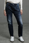 A classic mid-blue denim with gentle fading and a naturally contoured wash. Designed in a slim fit with a mid-rise waist, these jeans combine structure and everyday comfort through a low-stretch cotton blend.