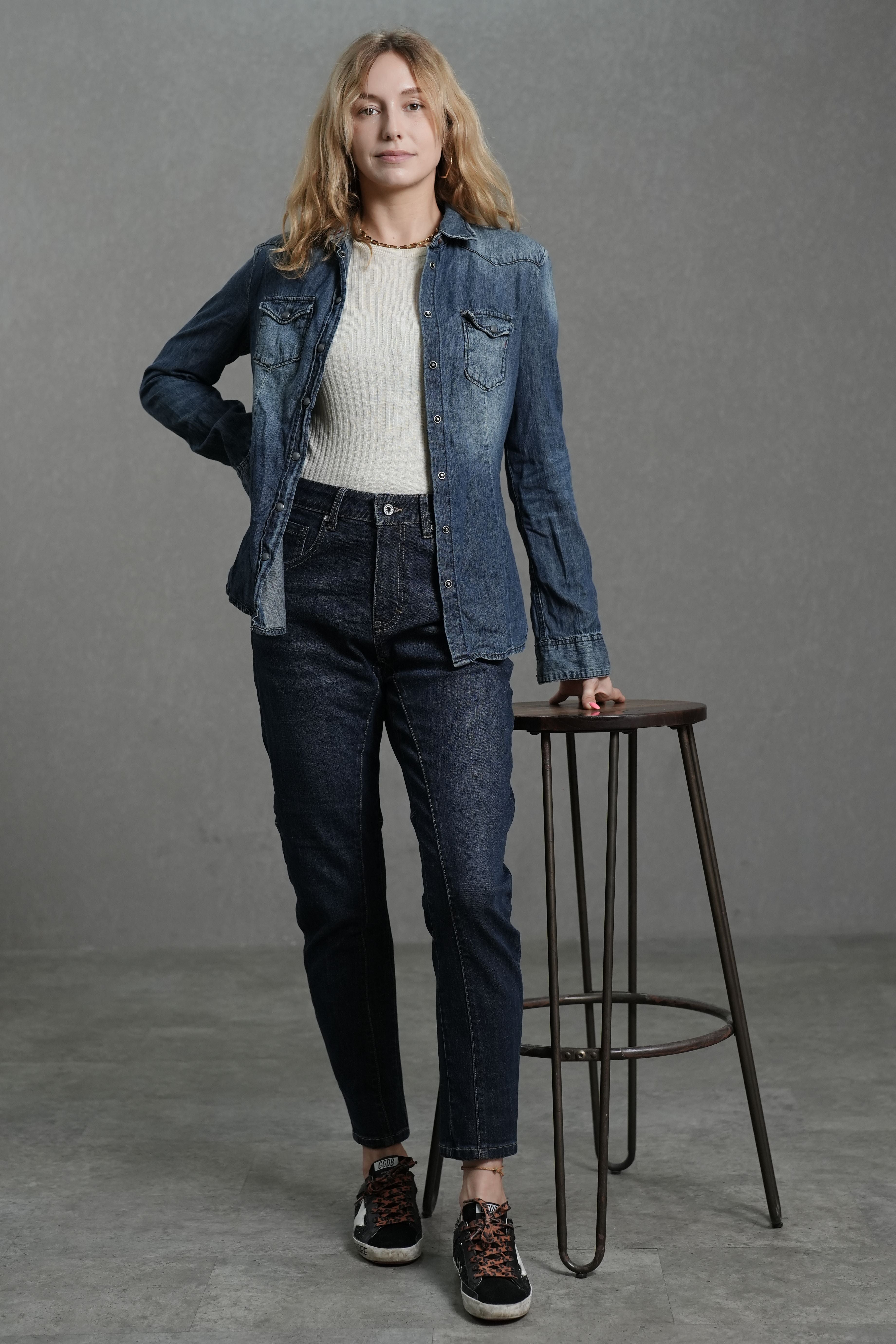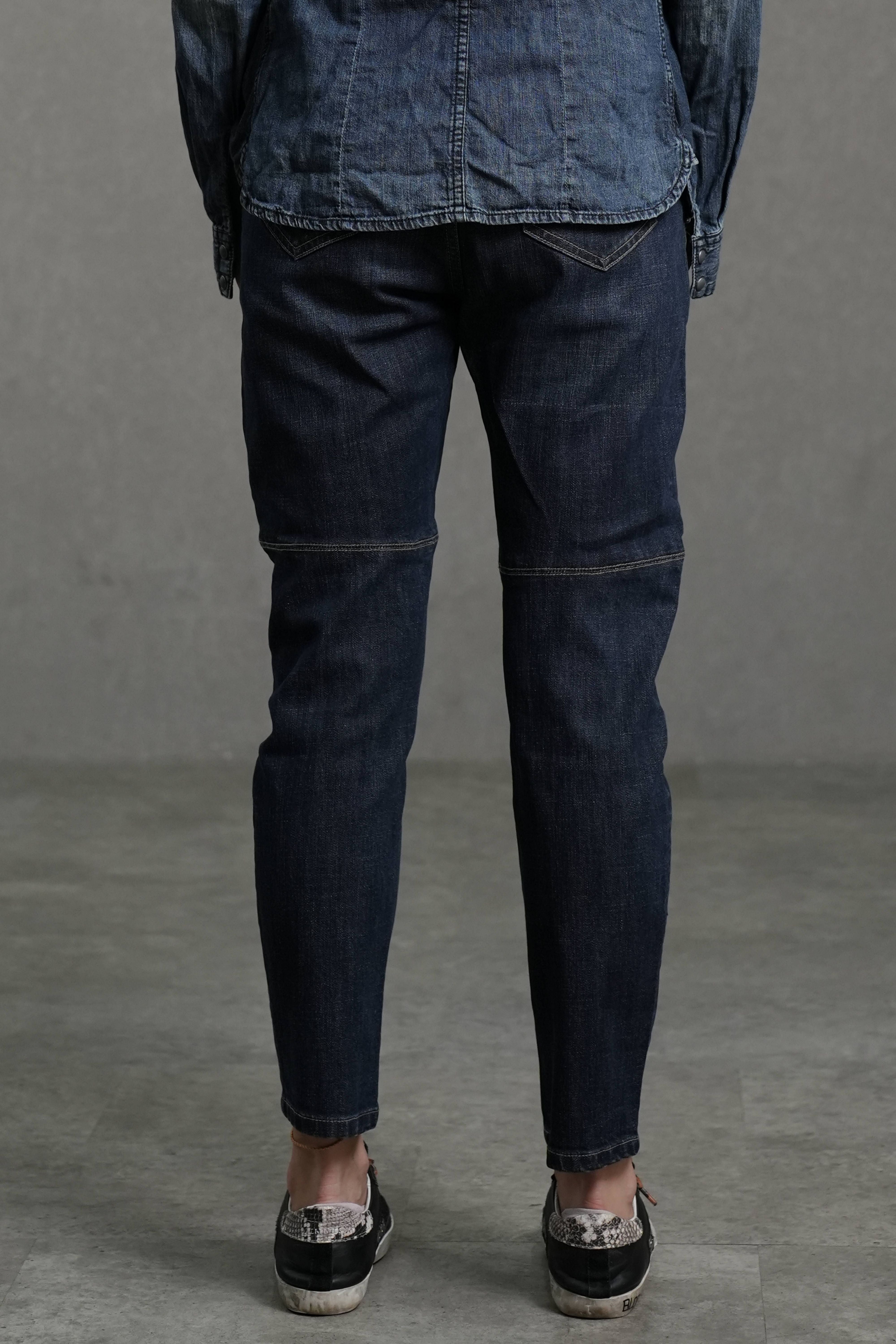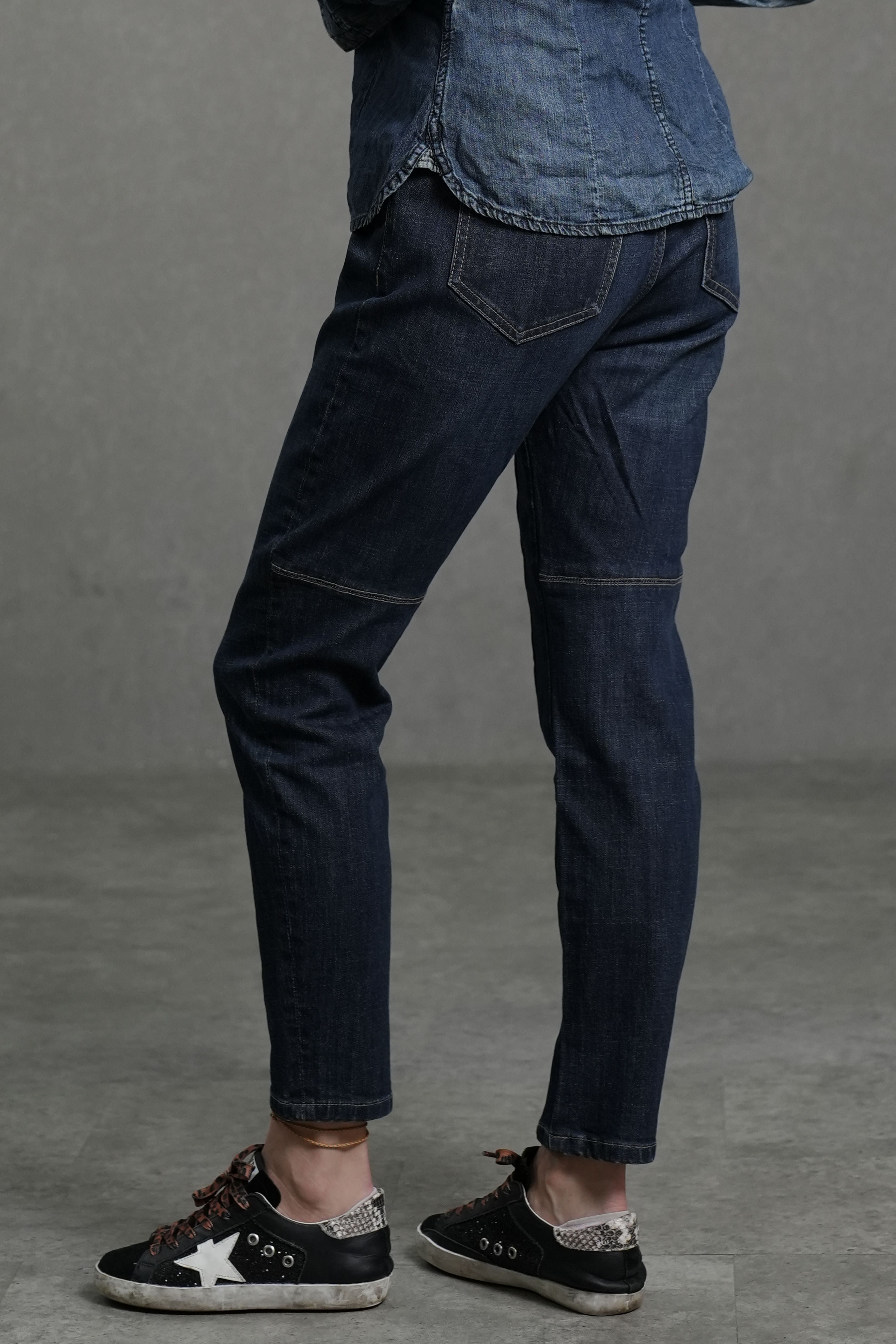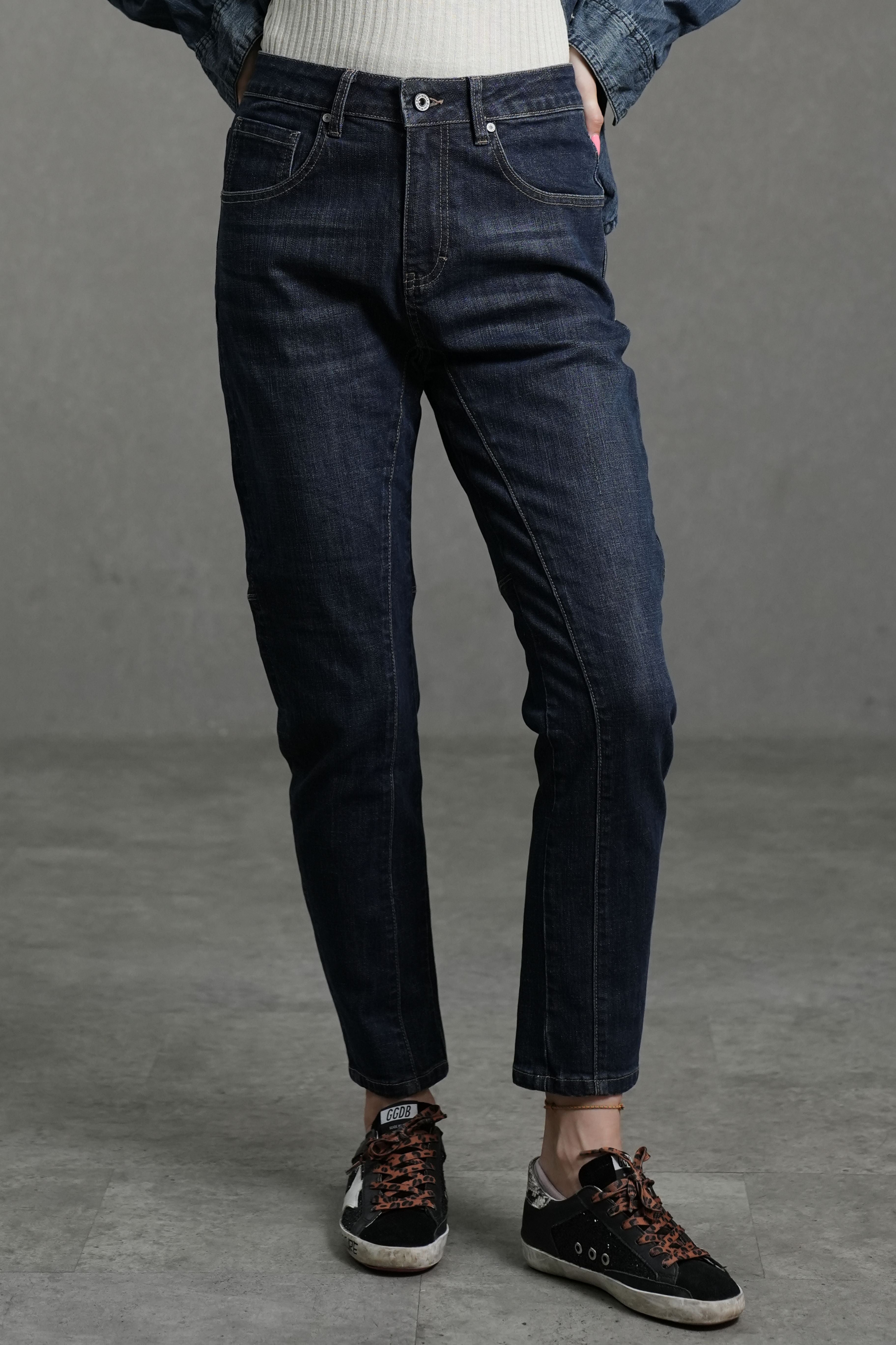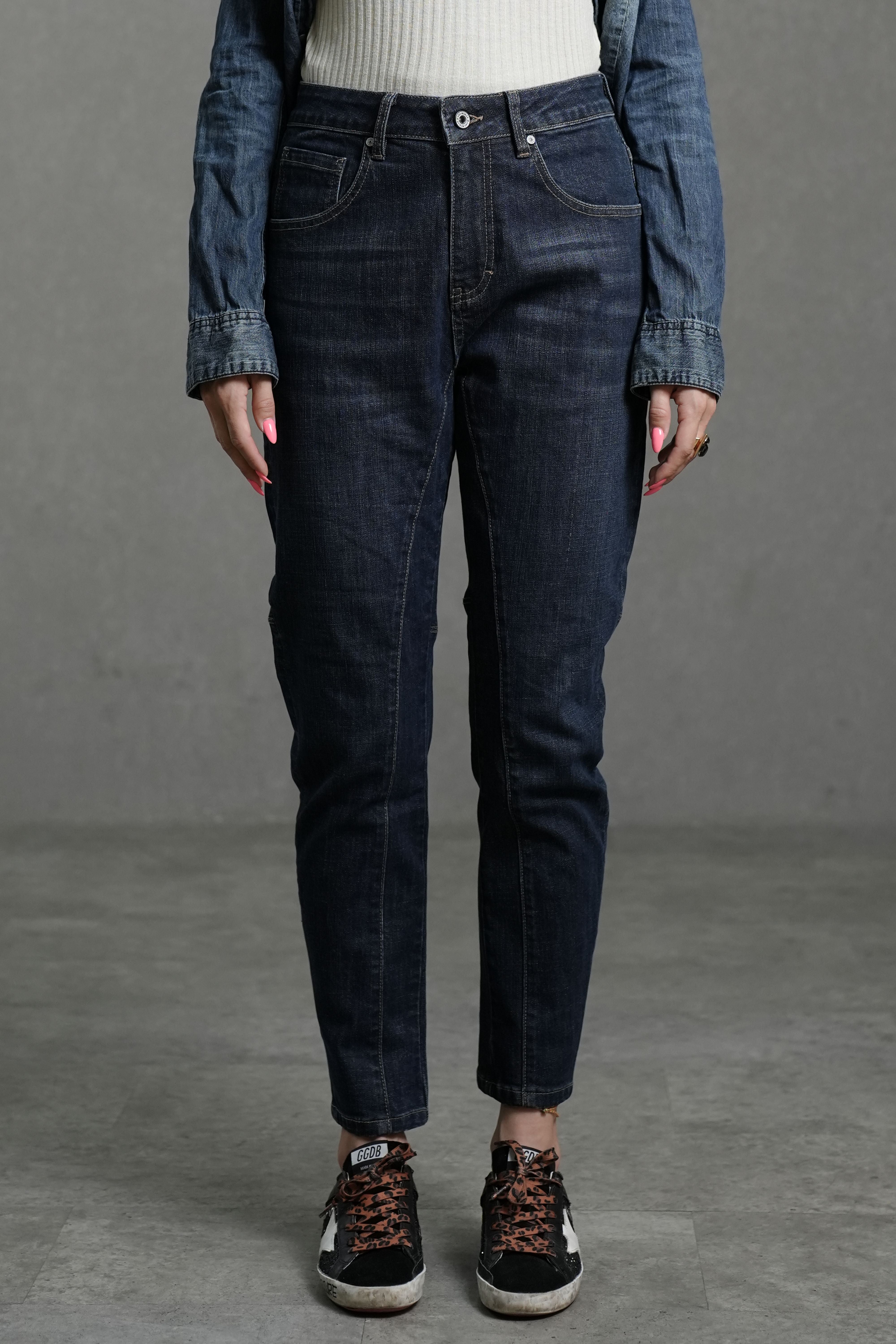 Designed with a mid-rise waist and an easy relaxed fit, these jeans offer room through the hip and thigh while keeping a clean, streamlined leg. Crafted from low-stretch denim for shape retention, the deep blue wash with subtle whiskering adds a polished, everyday feel—comfortable for all-day wear and effortless to style.