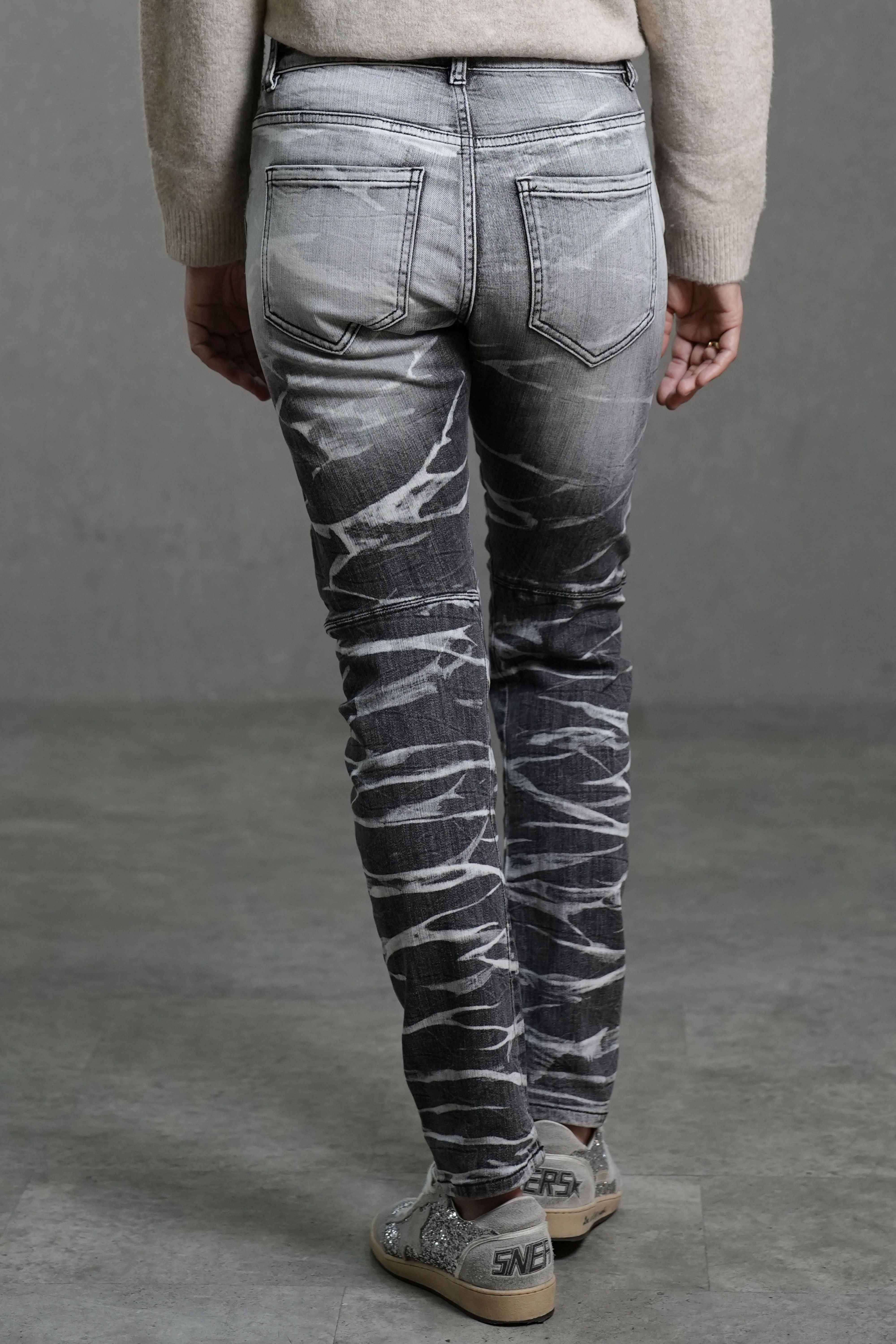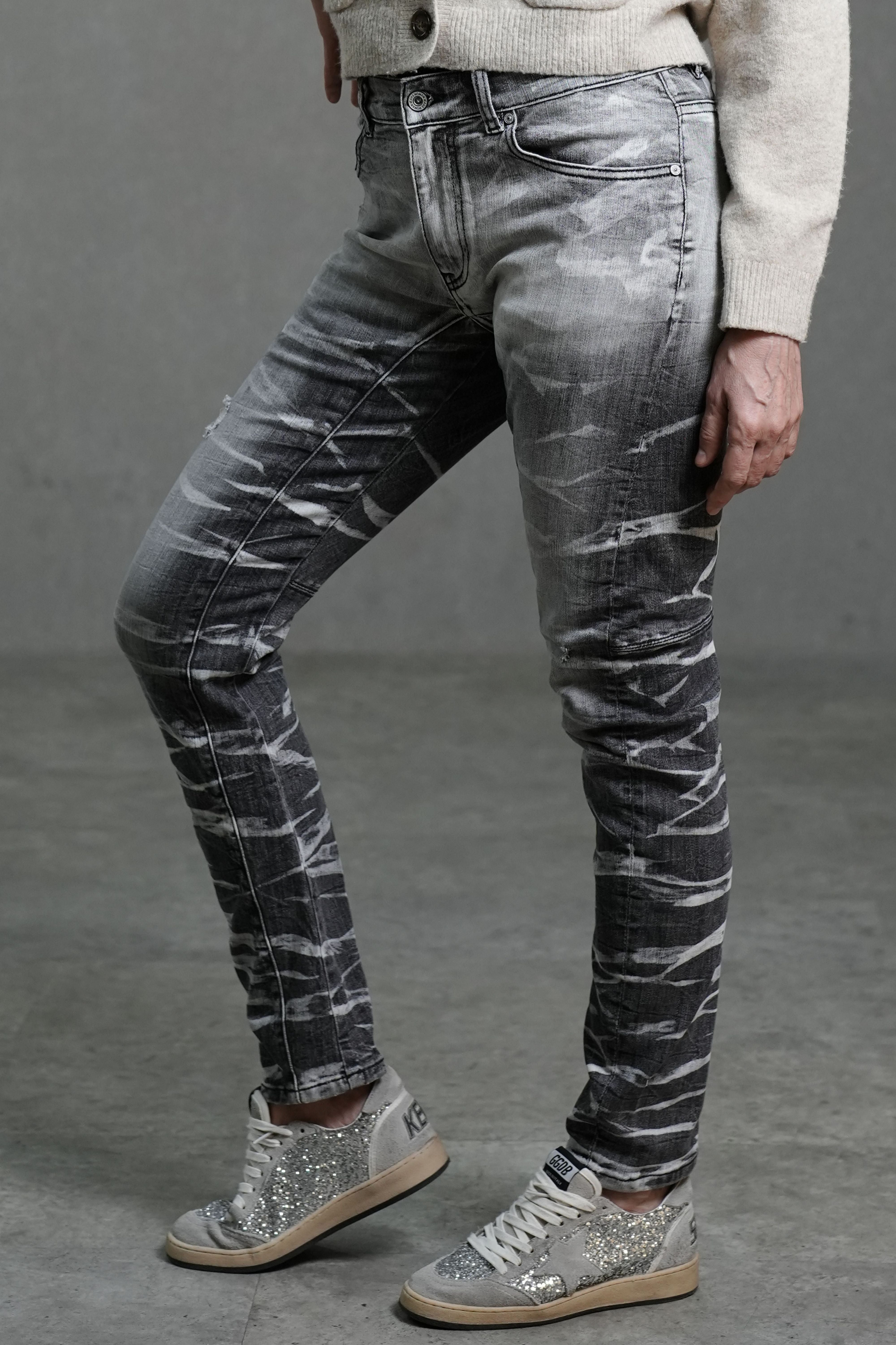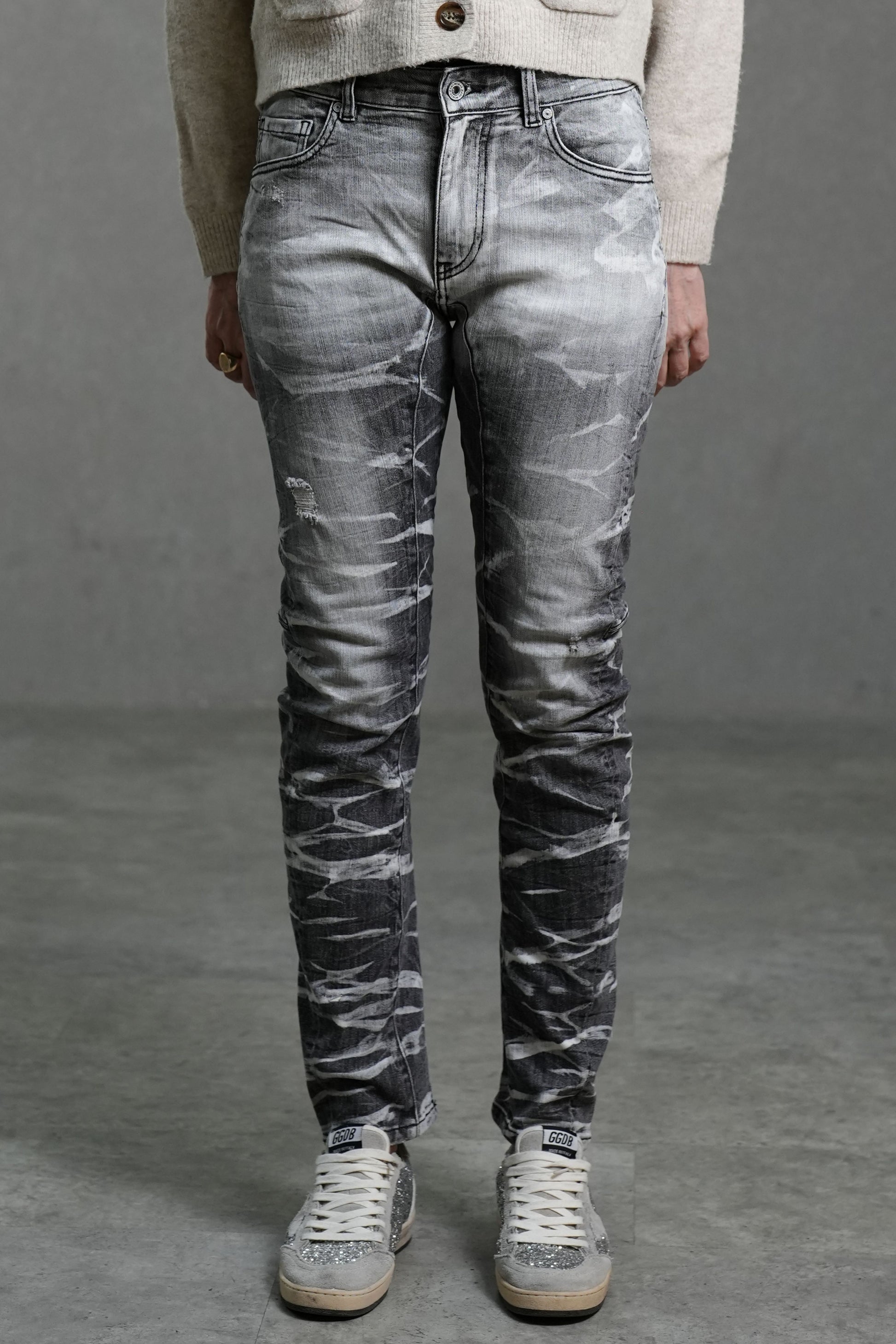 Crafted from smooth, mid-stretch denim that moves with ease, these jeans feature a slim tapered cut that narrows from thigh to ankle for a streamlined silhouette. The grey washed finish is enhanced with a bold distressed wave effect, adding a unique statement look with modern edge.