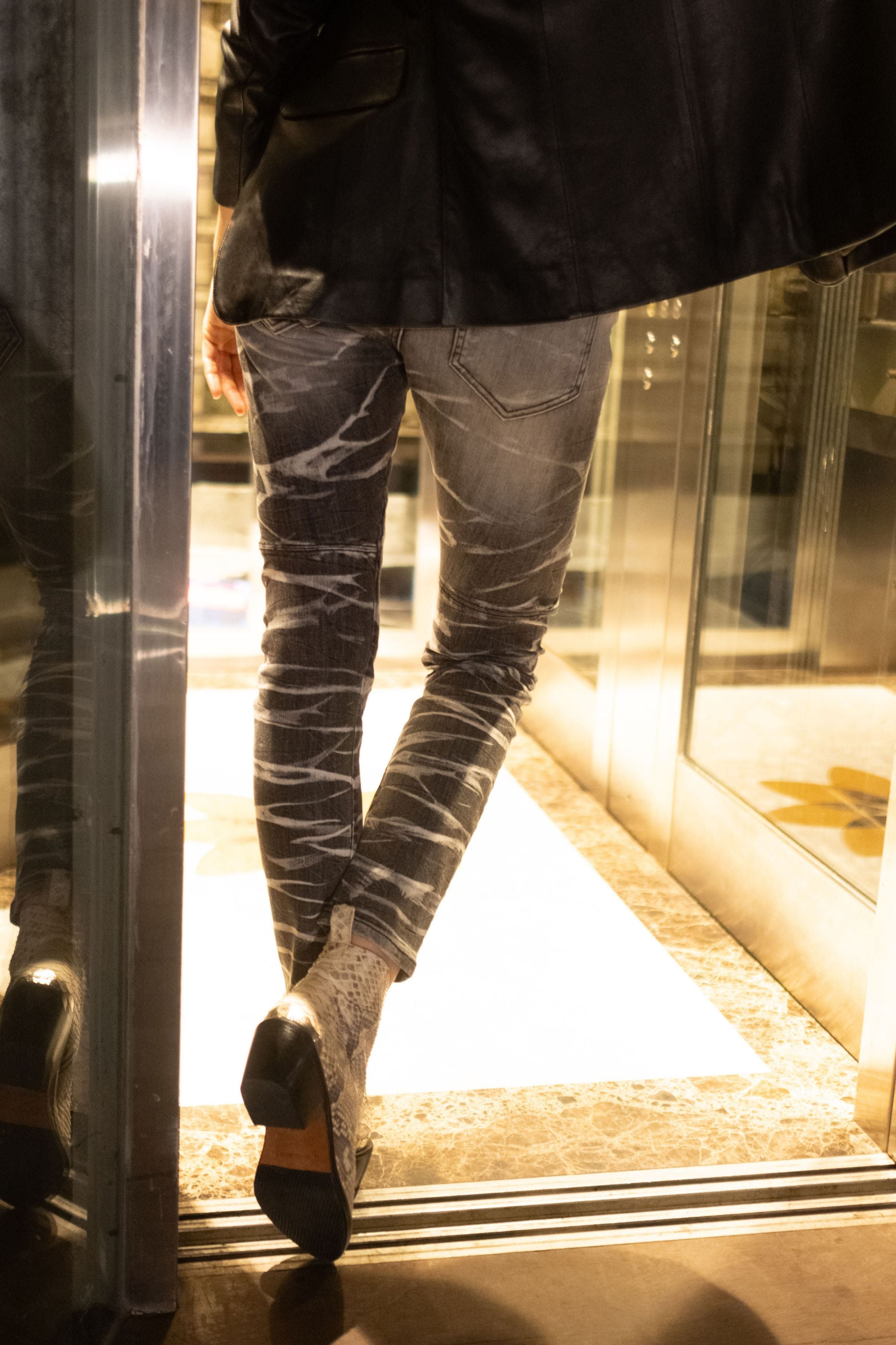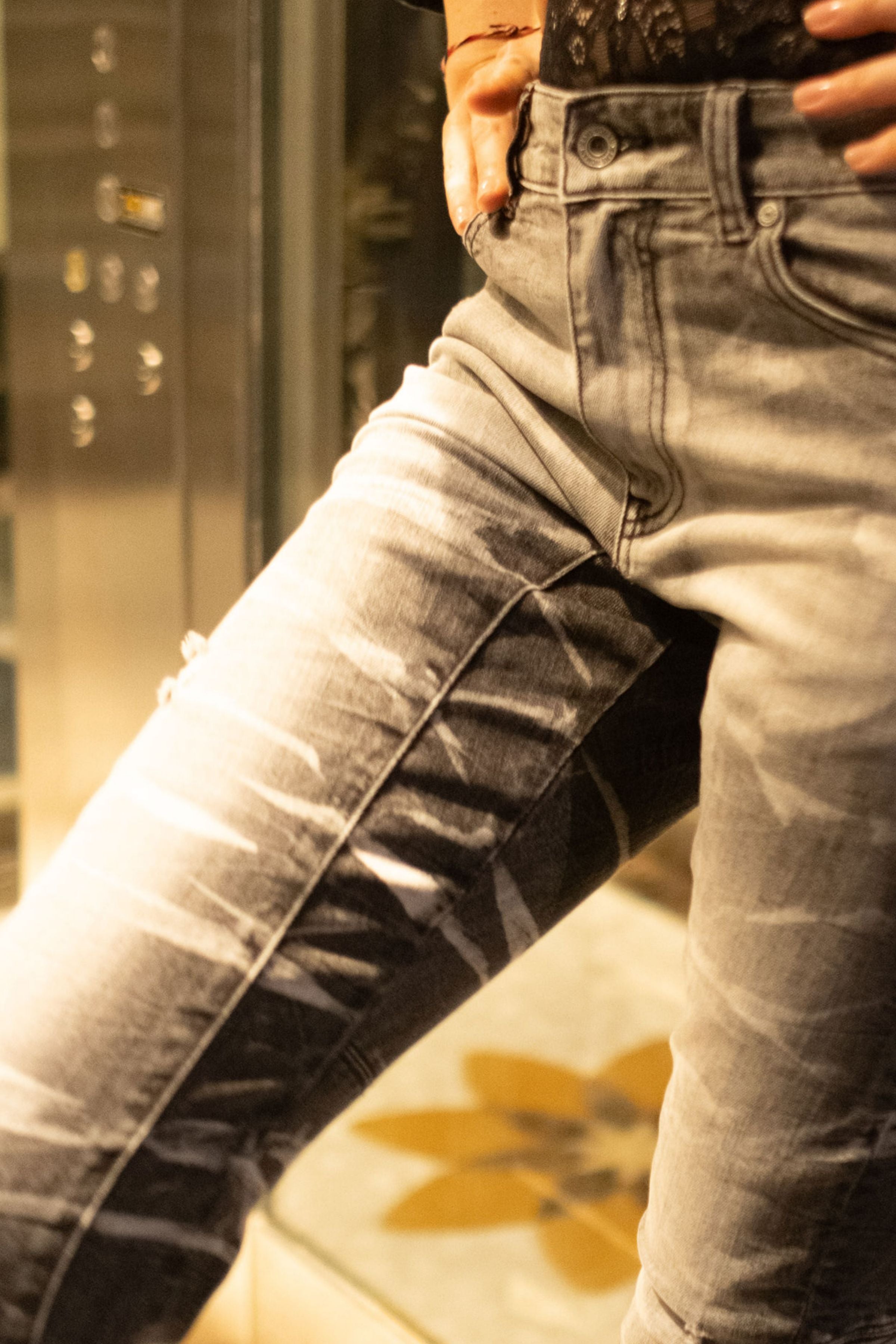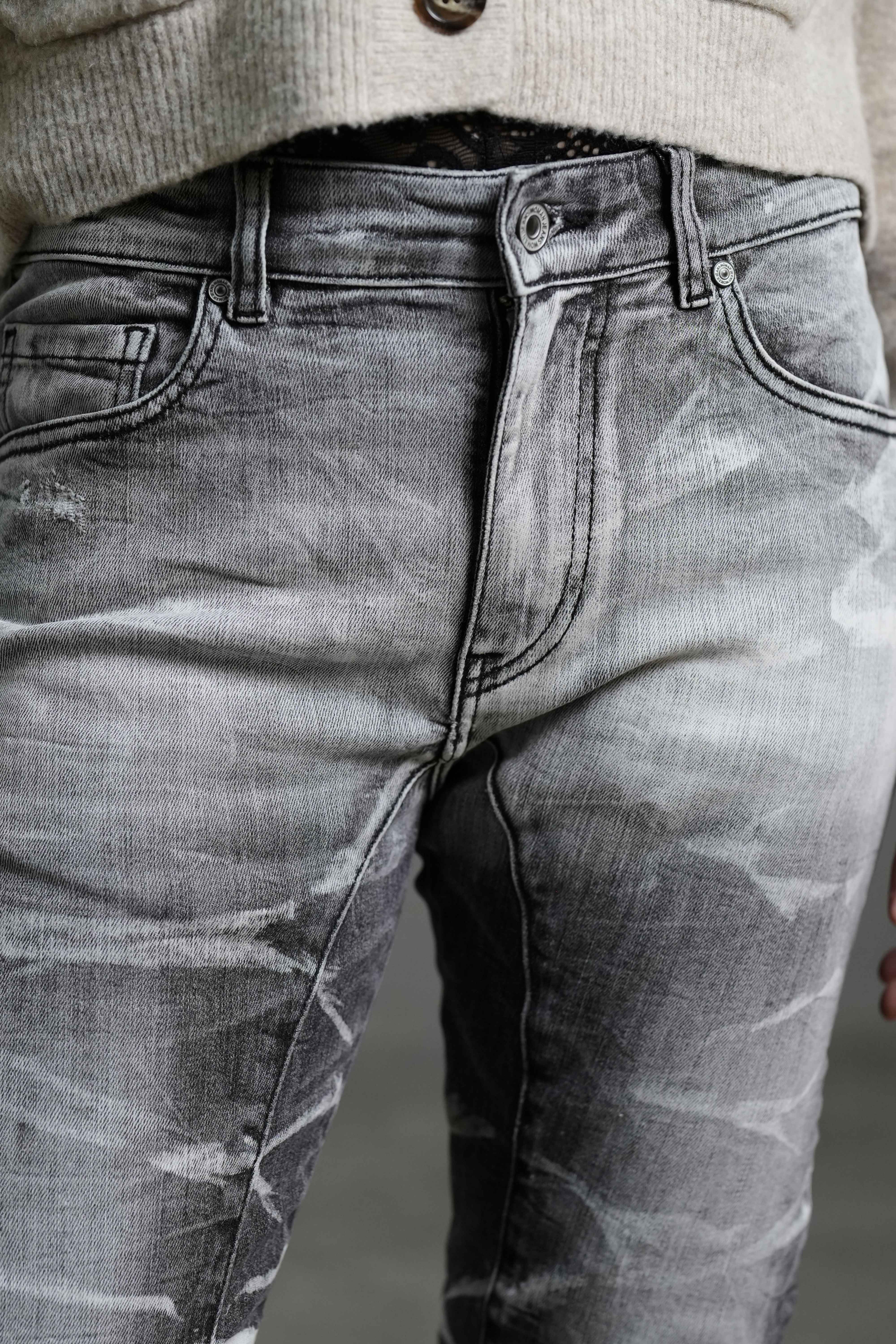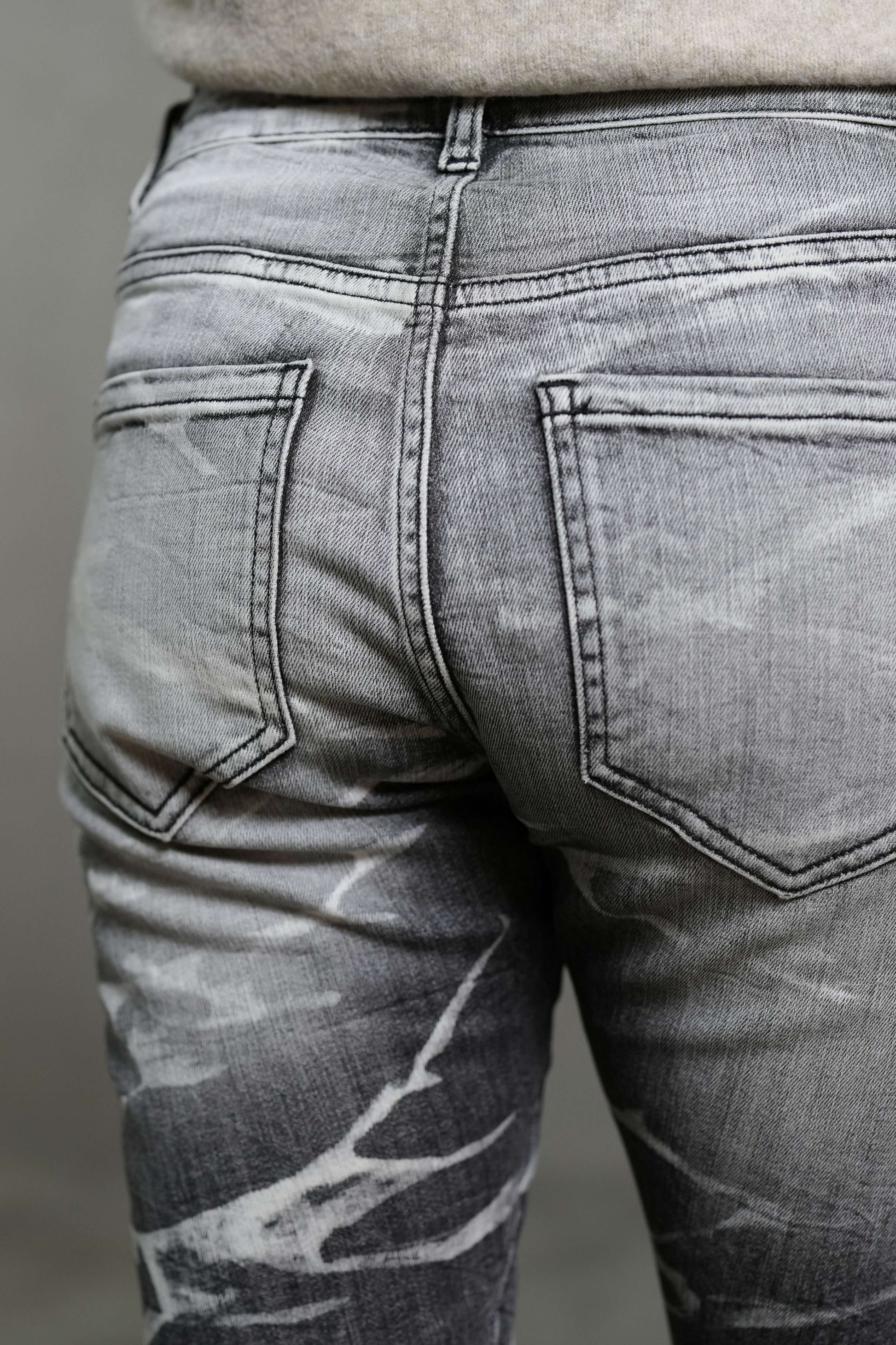 Crafted from smooth, mid-stretch denim that moves with ease, these jeans feature a slim tapered cut that narrows from thigh to ankle for a streamlined silhouette. The grey washed finish is enhanced with a bold distressed wave effect, adding a unique statement look with modern edge.