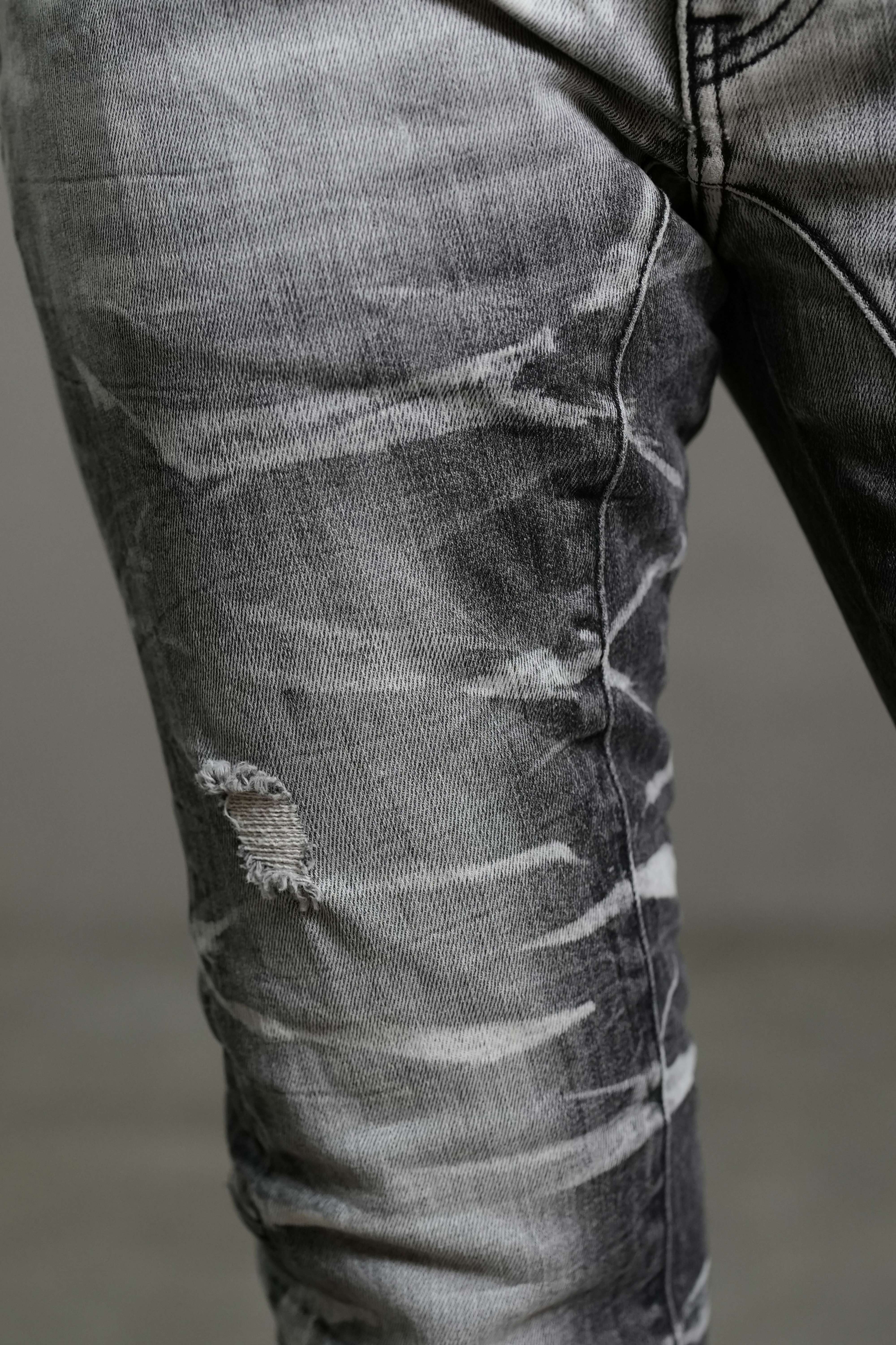 Grey Washed Mid-Stretch Slim Tapered Jeans with Distressed Wave Effect